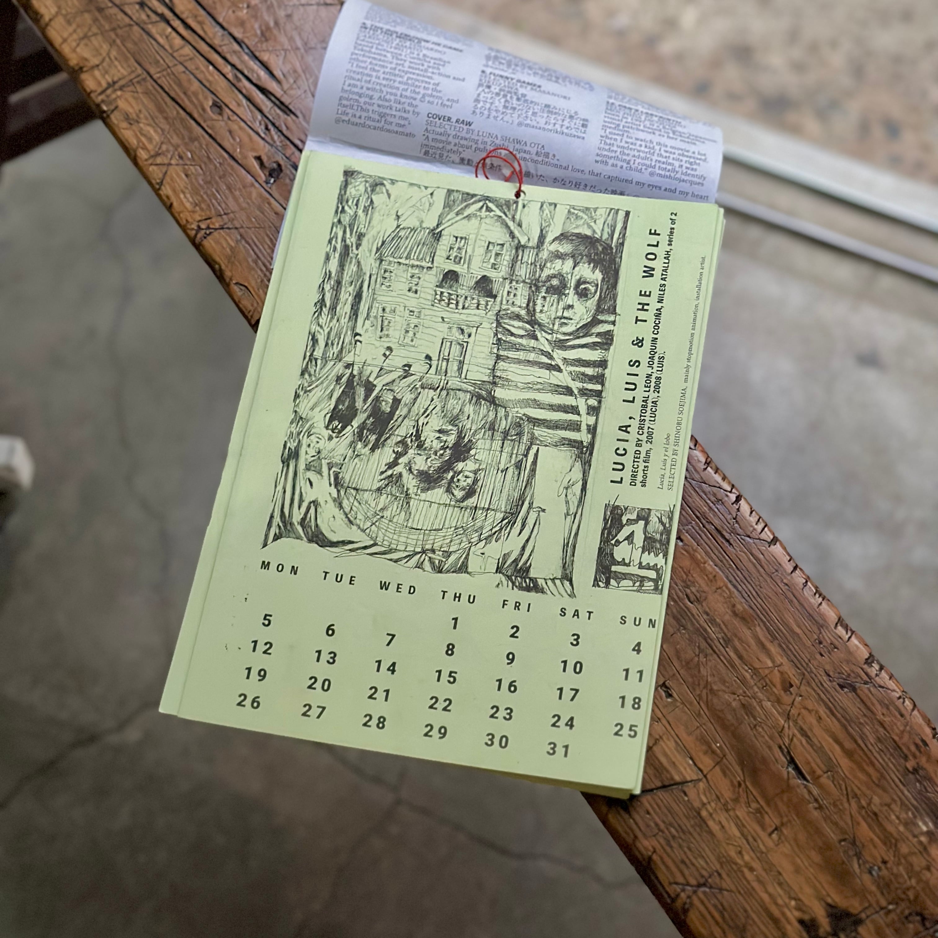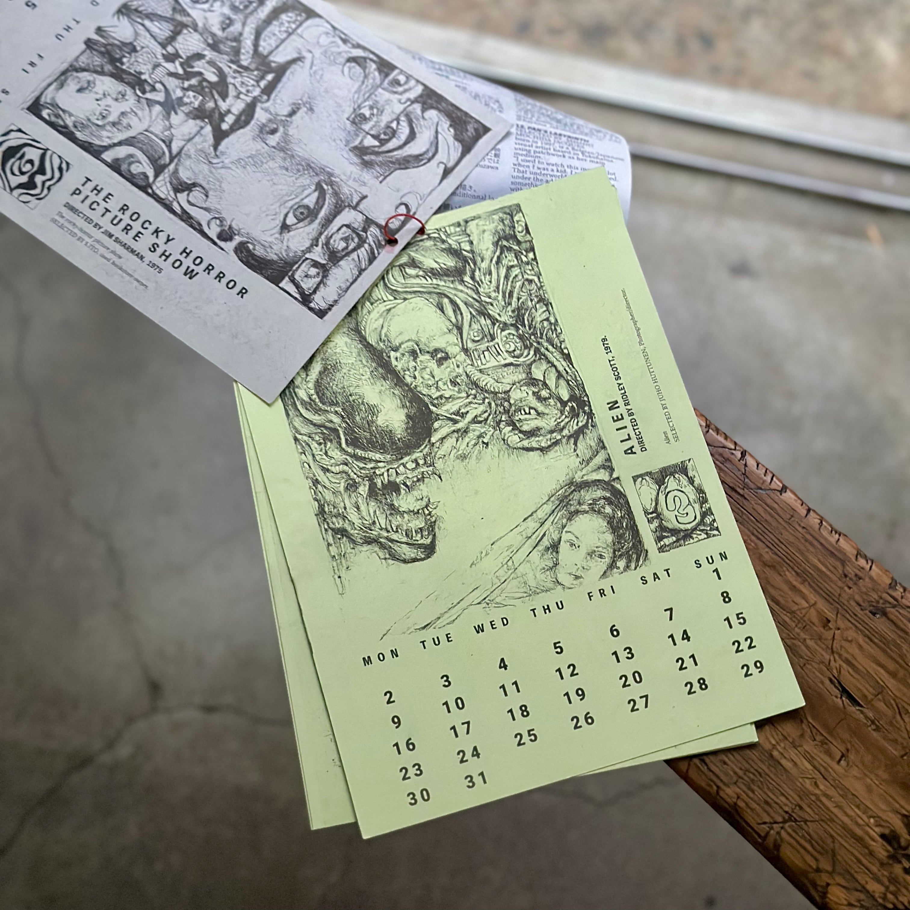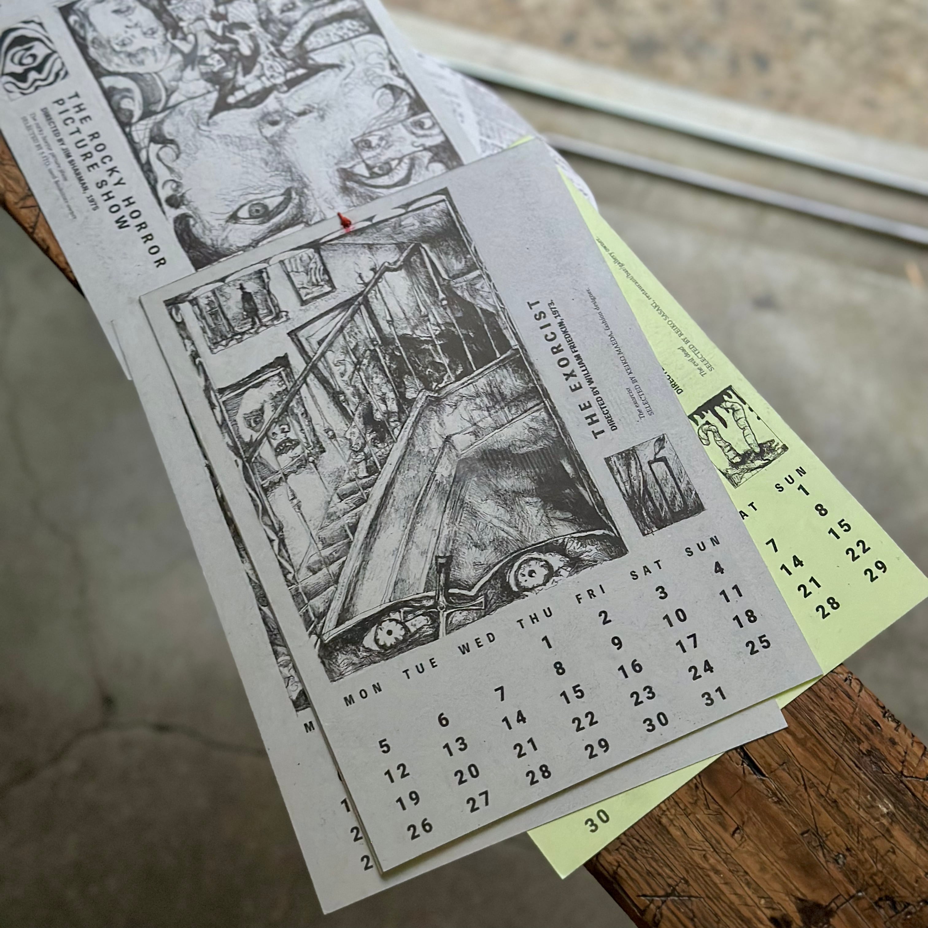 知り合い12人が選んでくれた映画を元にイラストを描いて、厚めのダンボール紙に黒でリソグラフプリントした、少し怖くてまあまあカッコいいカレンダーです