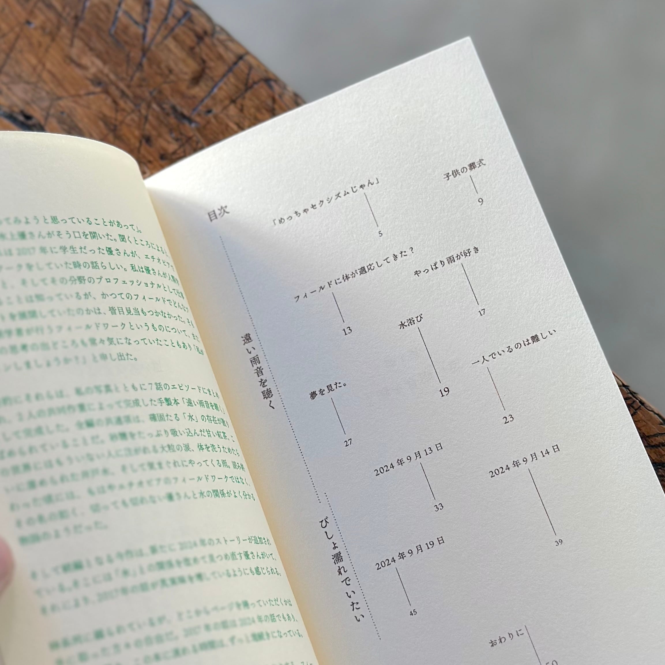 人類学者として活動する水上は2017年、修士課程の研究で滞在していたエチオピアでの出来事を、ウェブ上で公開していた。その文章を7話に再編し、イメージに高橋が撮り溜めた写真を用い構成、完全手製本として昨年発売された「遠い雨音を聴く」。