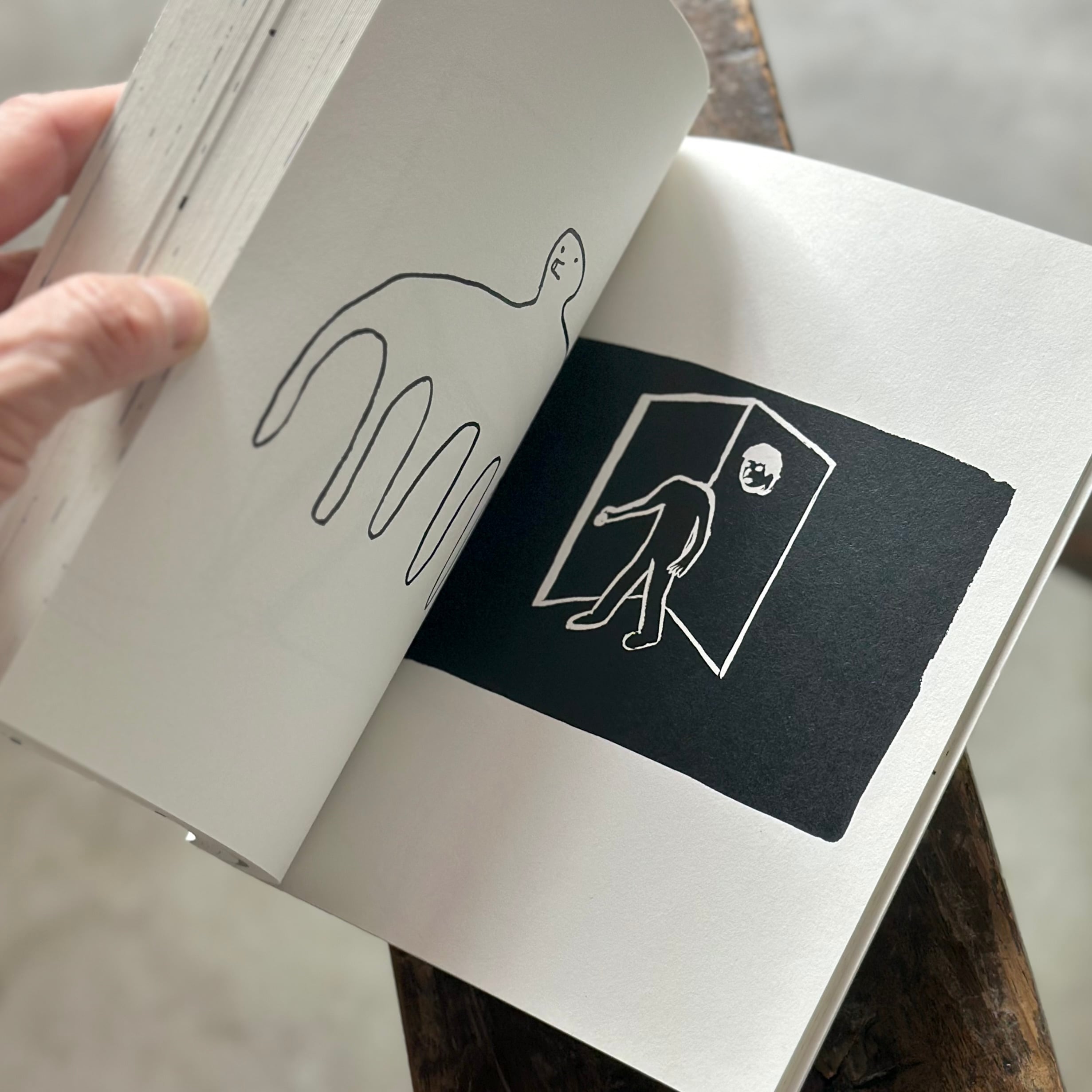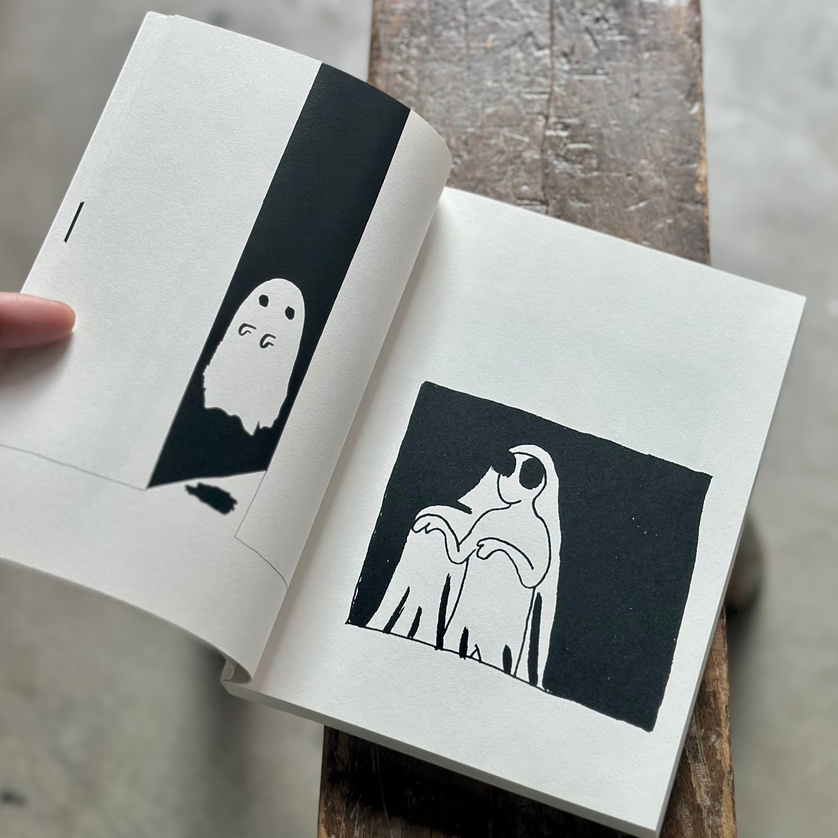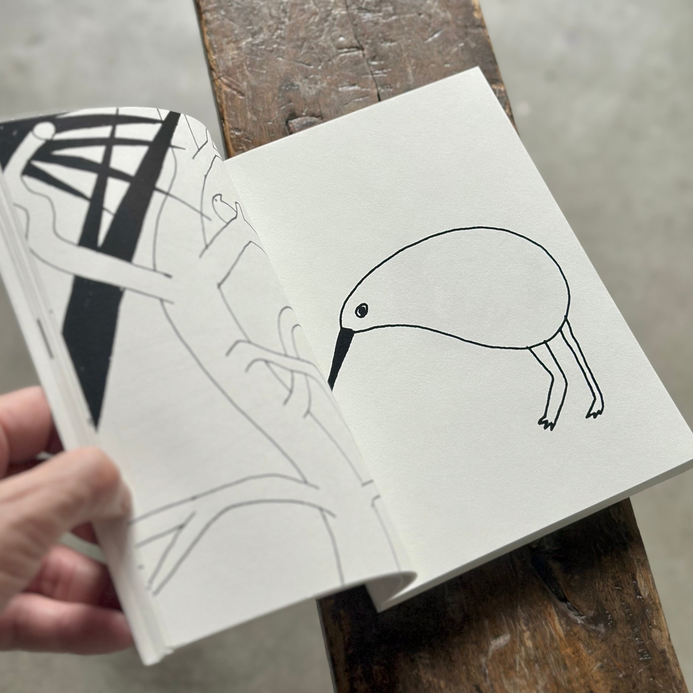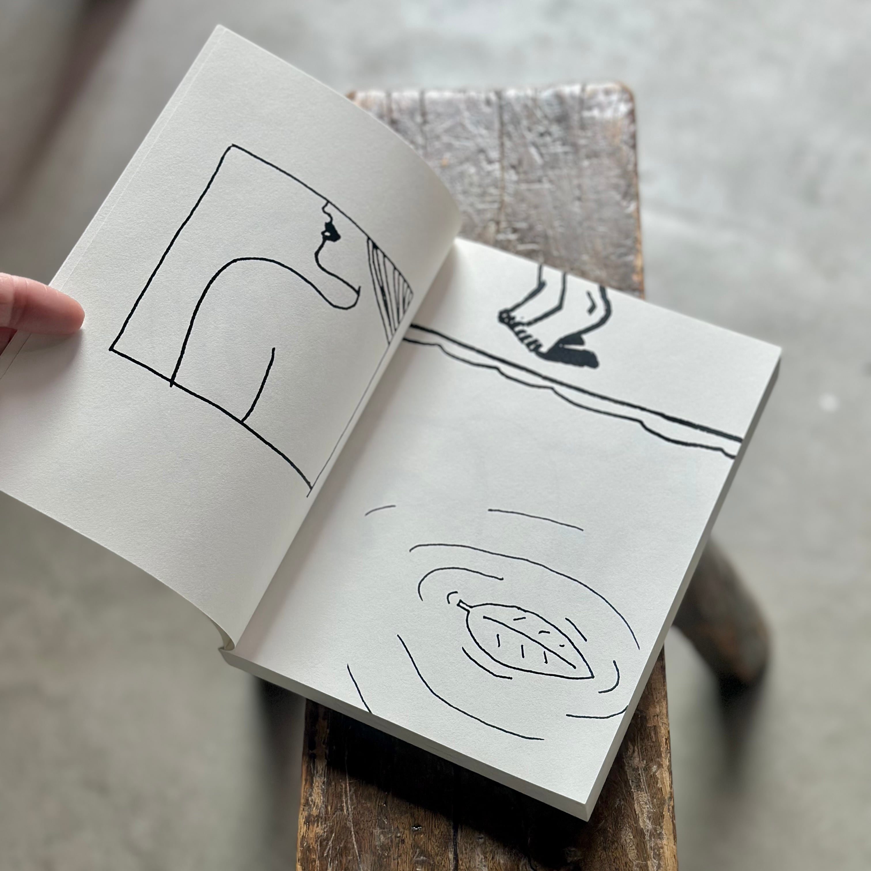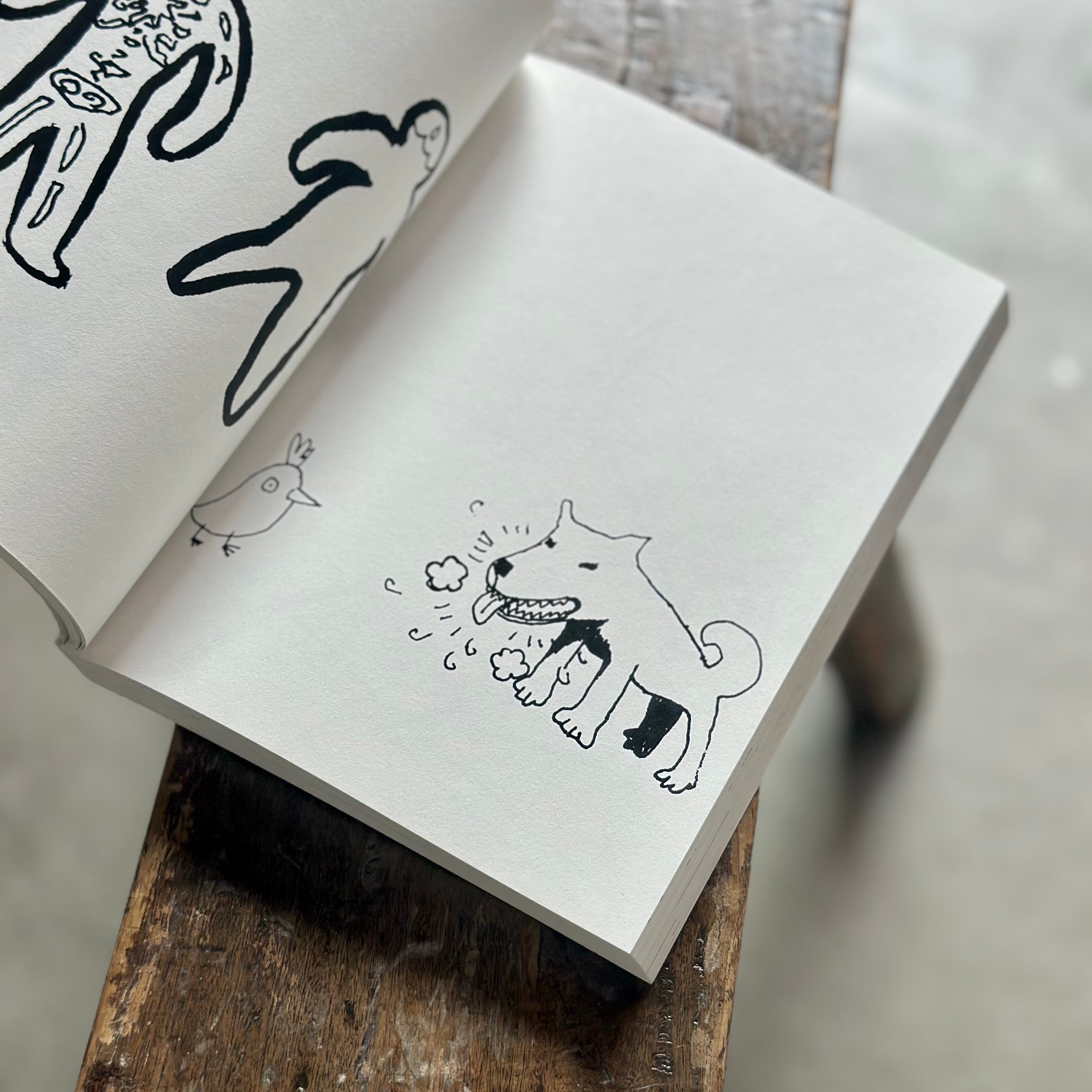 活動拠点であるドイツでのコロナ禍中、活動を大幅に制限された日々の中で描き溜めた小さなスケッチを、拡大・再構成して塗り絵のように仕立てています。虚構と現実が入り混じるシュールな世界観、動物などのモチーフのユーモラスな表情、そして色を持たない簡潔な線画のタッチが、私たちの記憶のどこかにある、知っているけど忘れてしまったいつかの風景と響きあいます。