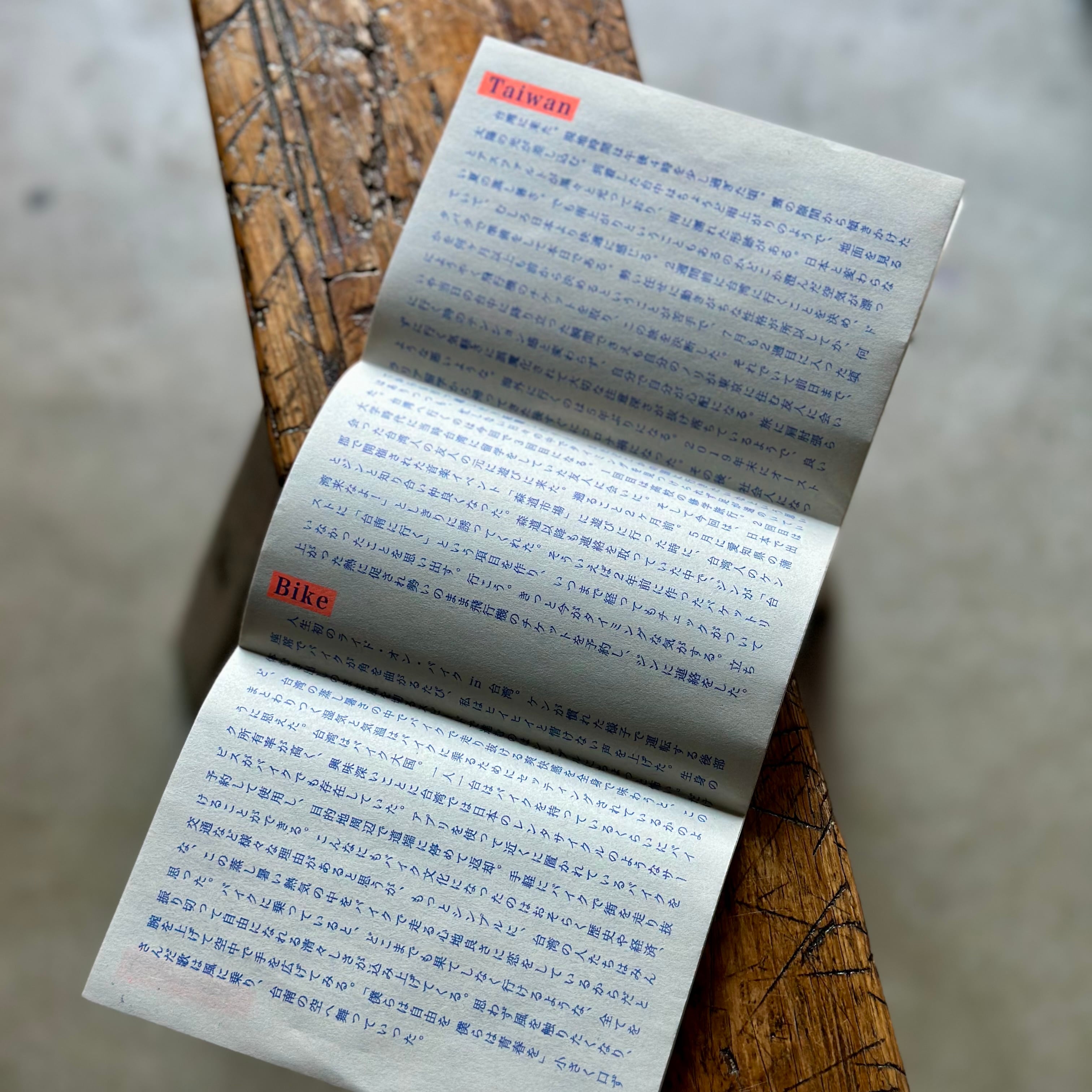 台湾人の友人とともに過ごした台中・台南で感じたこと、目に映った景色を形にする。その過程の中で気づいたことは、『理解というもの以前の拙いながらに言葉を交わすこと、同じ時間を共有することでお互いを伝え合おうとするコミュニケーションに灯る原始的な喜びに幾度となく触れていたこと』